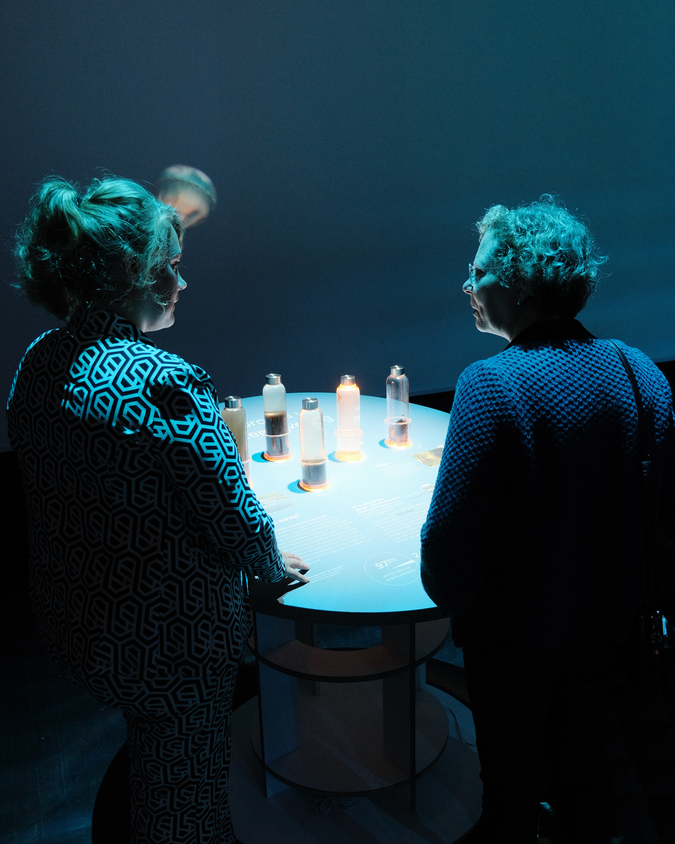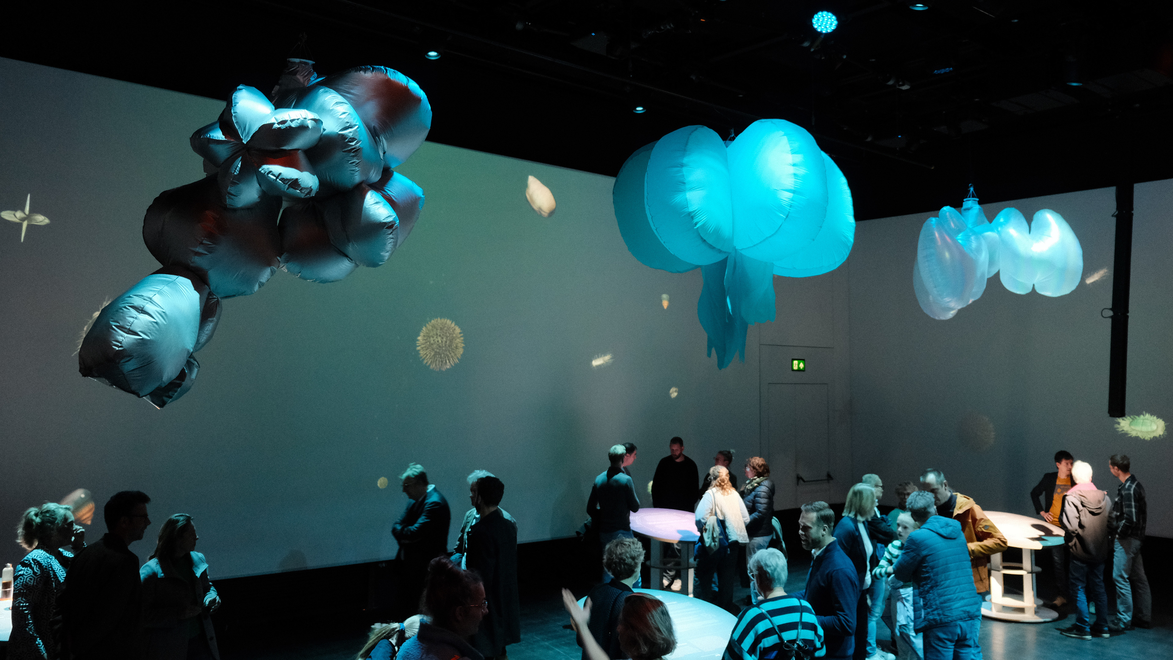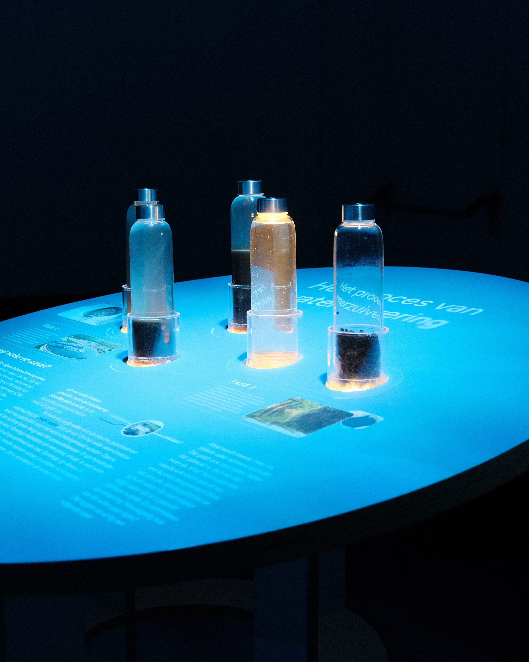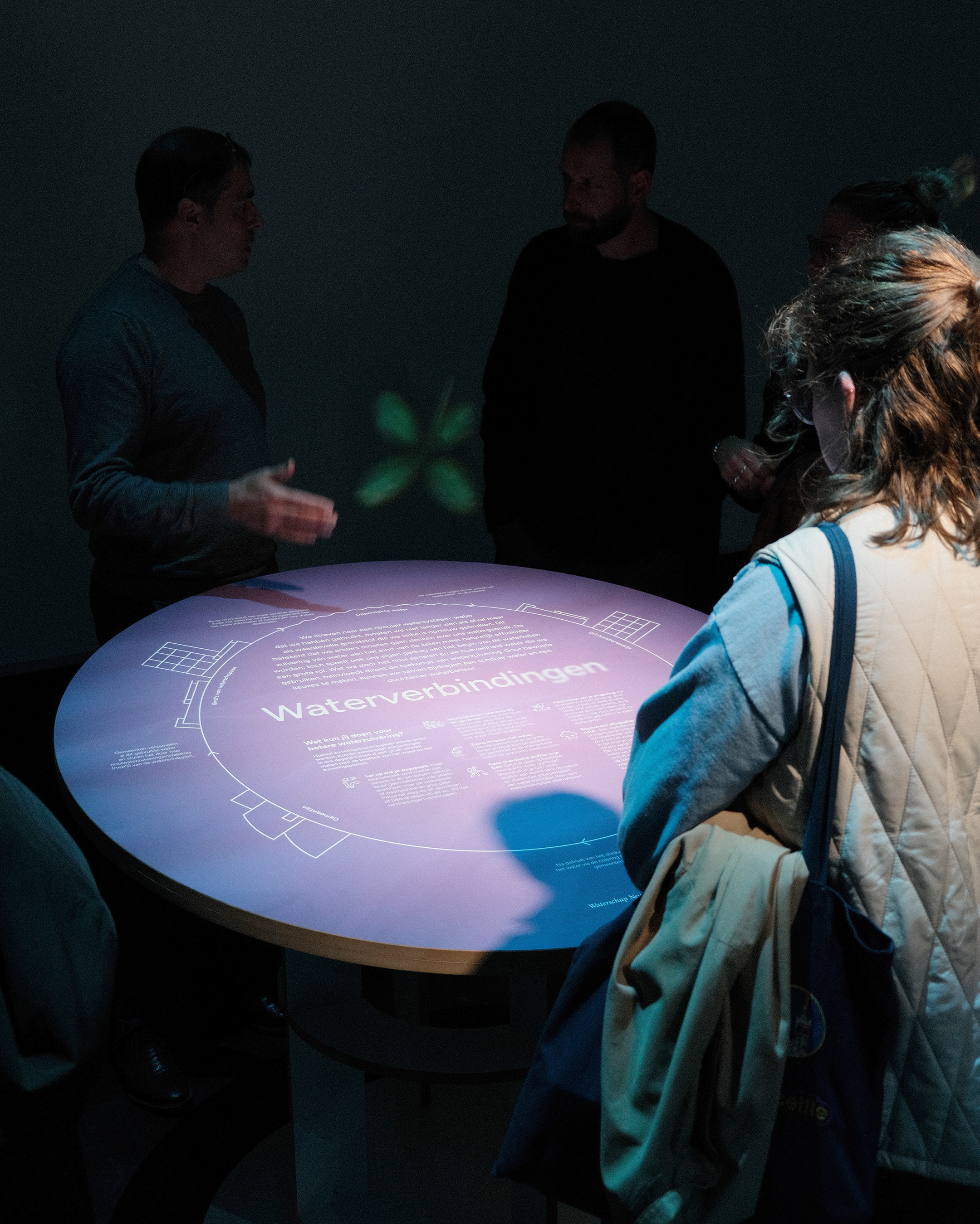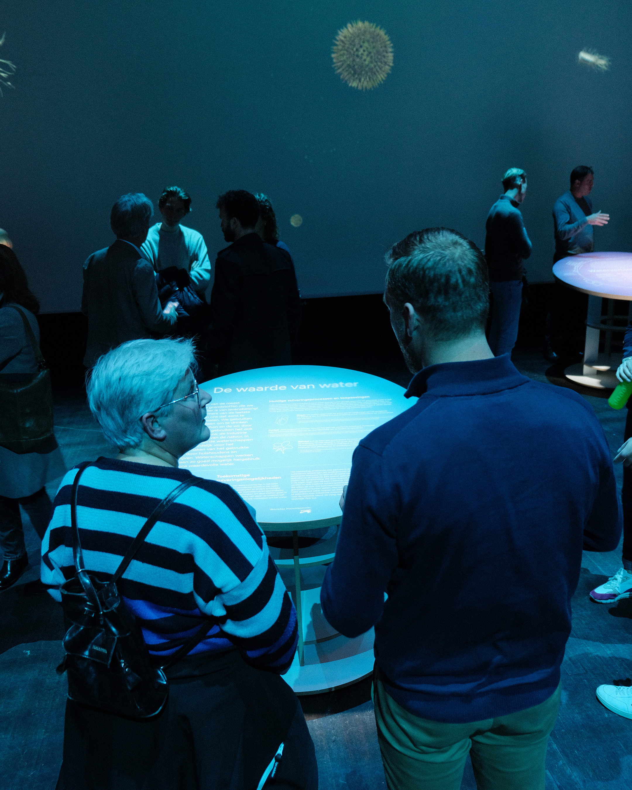 Onder de noemer De waarde van water ontwikkelden we een experience waarbij bezoekers een onderwaterbeleving konden ervaren. De Rabozaal van het Forum (met een rondom projectiemogelijkheid) hebben we omgetoverd tot onderwaterwereld inclusief gedempt onderwatergeluid, animaties van de elementen die in water zitten en levensgrote organismen die aan het plafond hingen en bewogen. Deze kunstobjecten zijn verzorgd door Paul & Albert en gemaakt door Lidi Bus. Deze combinatie van educatie en beleving maakt het thema tastbaar en inspirerend. Het concept richt zich op verschillende doelgroepen. Voor professionals en zakelijke stakeholders ligt de nadruk op de technologische en economische kant van waterzuivering en hergebruik. Voor het brede publiek, zoals bezoekers van Let’s Gro, draait het om bewustwording en inspiratie. Ook voor later gebruik vormen scholen, open dagen, evenementen en symposia een belangrijke doelgroep, waarbij het educatieve karakter centraal staat. De voorstelling biedt een complete blik op waterzuivering. Aan de voorkant belicht het preventieve maatregelen en stedelijke waterinrichting. Aan de achterkant laat het zien hoe recycling en technologische innovaties bijdragen aan hergebruik en duurzaamheid.